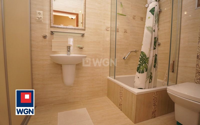 W łazience: kabina prysznicowa, umywalka z szafką, lustro na ścianę, wc, szafa w zabudowie z miejscem na pralkę. Łazienka wykończona w jasnych płytkach.